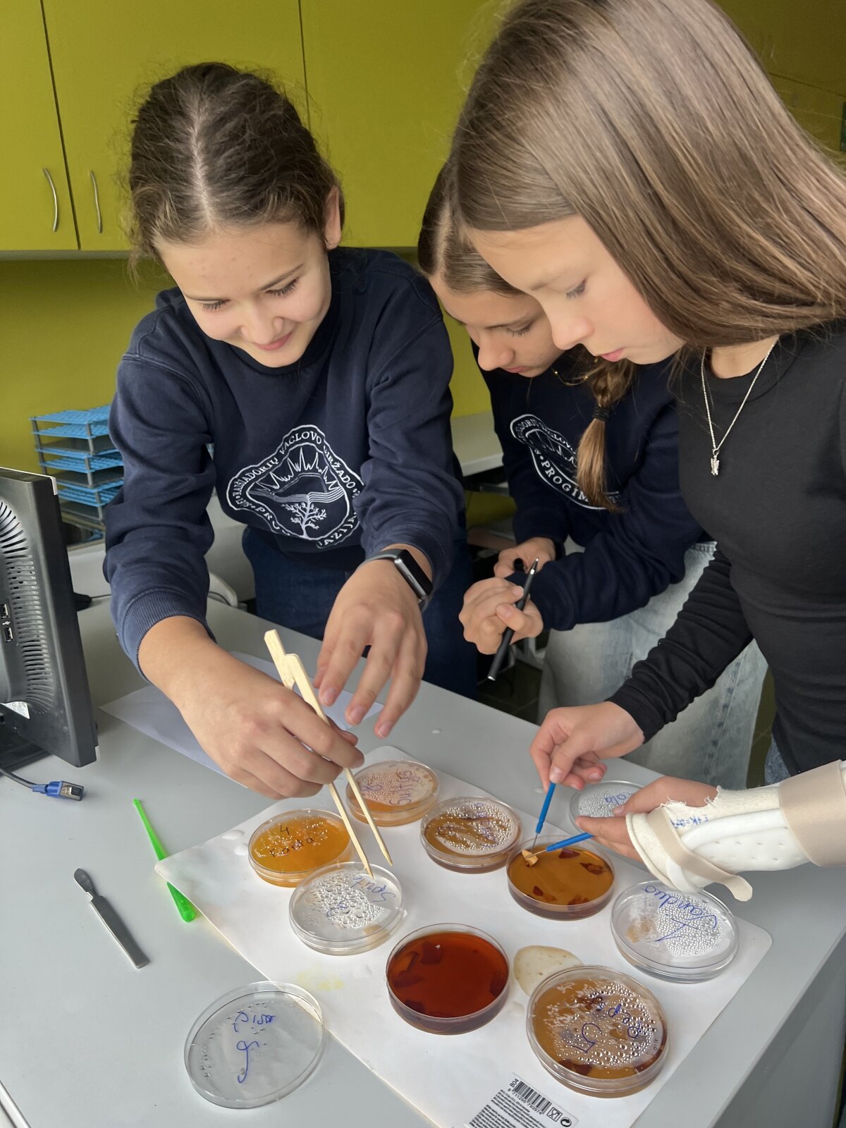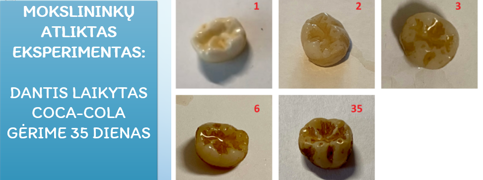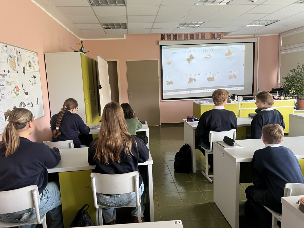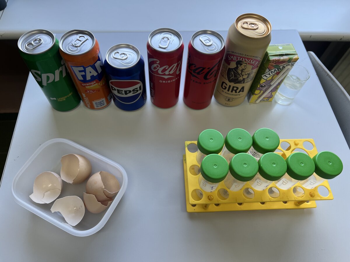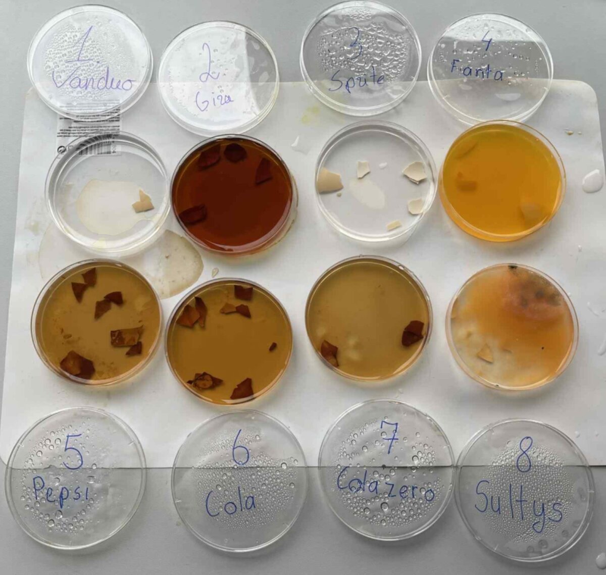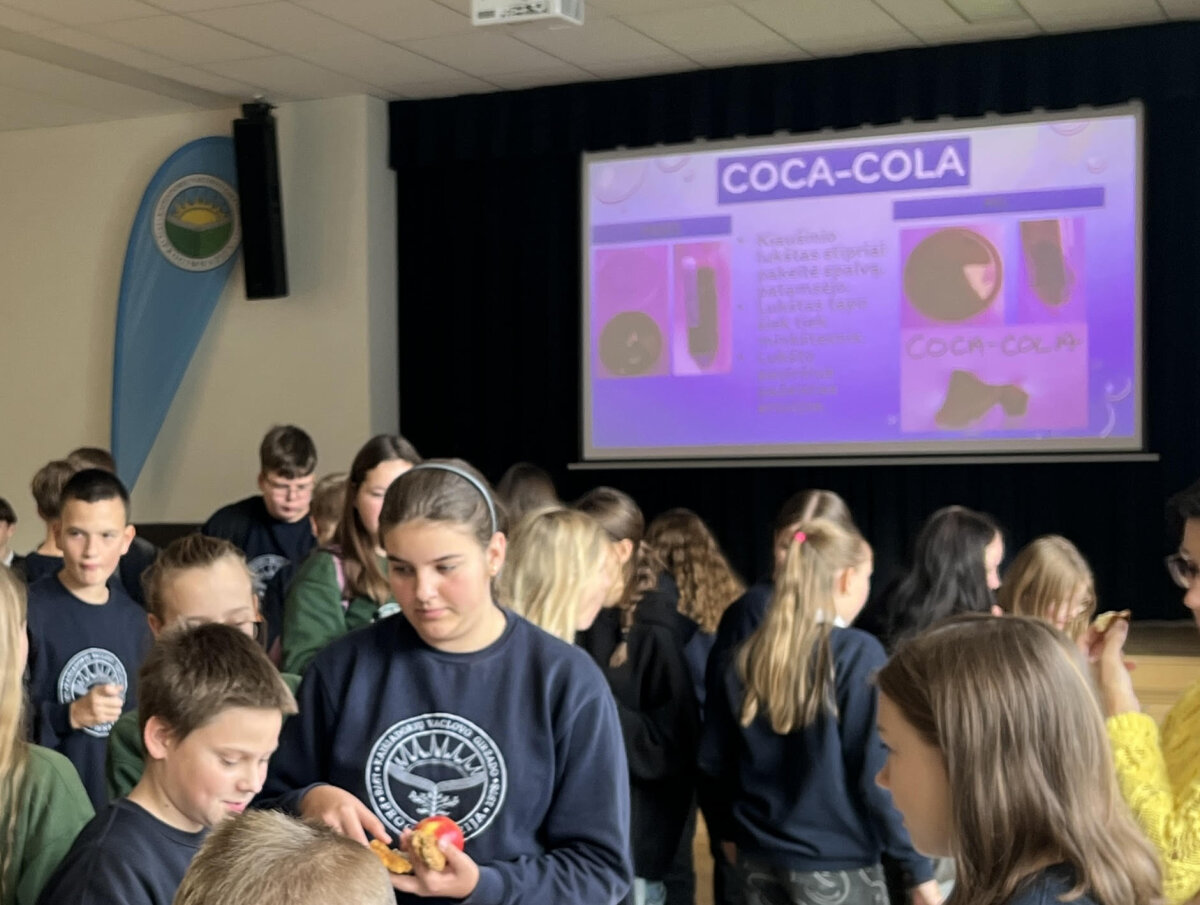 Minėdami spalio 15-ąją – Pasaulinę sveikos mitybos dieną, 7a ir 7c klasių mokiniai biologijos pamokų metu atliko įdomų ir naudingą bandymą – tyrė, kokią įtaką kiaušinio lukštui daro skirtingi gaivieji gėrimai. Eksperimento metu mokiniai naudojo aštuonis skirtingus skysčius: vandenį, girą, „Fanta“, „Sprite“, sultis, „Coca-Cola“, „Coca-Cola Zero“ ir „Pepsi“. Kiaušinio lukštas buvo pasirinktas ne atsitiktinai – jis puikiai tinka kaip žmogaus dantų emalio modelis. Dantų emalis yra kieta, išorinė danties dalis, sauganti jį nuo pažeidimų. Jo sudėtyje daugiausia yra kalcio fosfato junginių, kurie suteikia emaliui tvirtumo. Kiaušinio lukštas taip pat sudarytas iš kalcio karbonato, todėl yra chemiškai artimas dantų emaliui – abu šie junginiai tirpsta rūgštinėje aplinkoje. Būtent todėl rūgštūs ar saldūs gėrimai gali pakenkti tiek kiaušinio lukštui, tiek mūsų dantims. Tyrimas buvo atliekamas Petri lėkštelėse ir mėgintuvėliuose, o po keturių dienų mokiniai galėjo pastebėti akivaizdžius pokyčius. Rezultatai parodė, kad spalvoti, saldinti gėrimai ne tik nudažo kiaušinio paviršių, bet ir jį pažeidžia, tuo tarpu vanduo jokios žalos nepadarė.