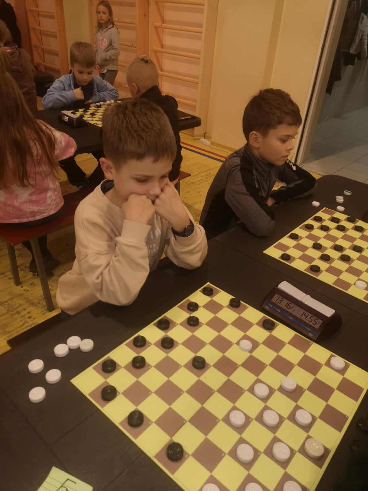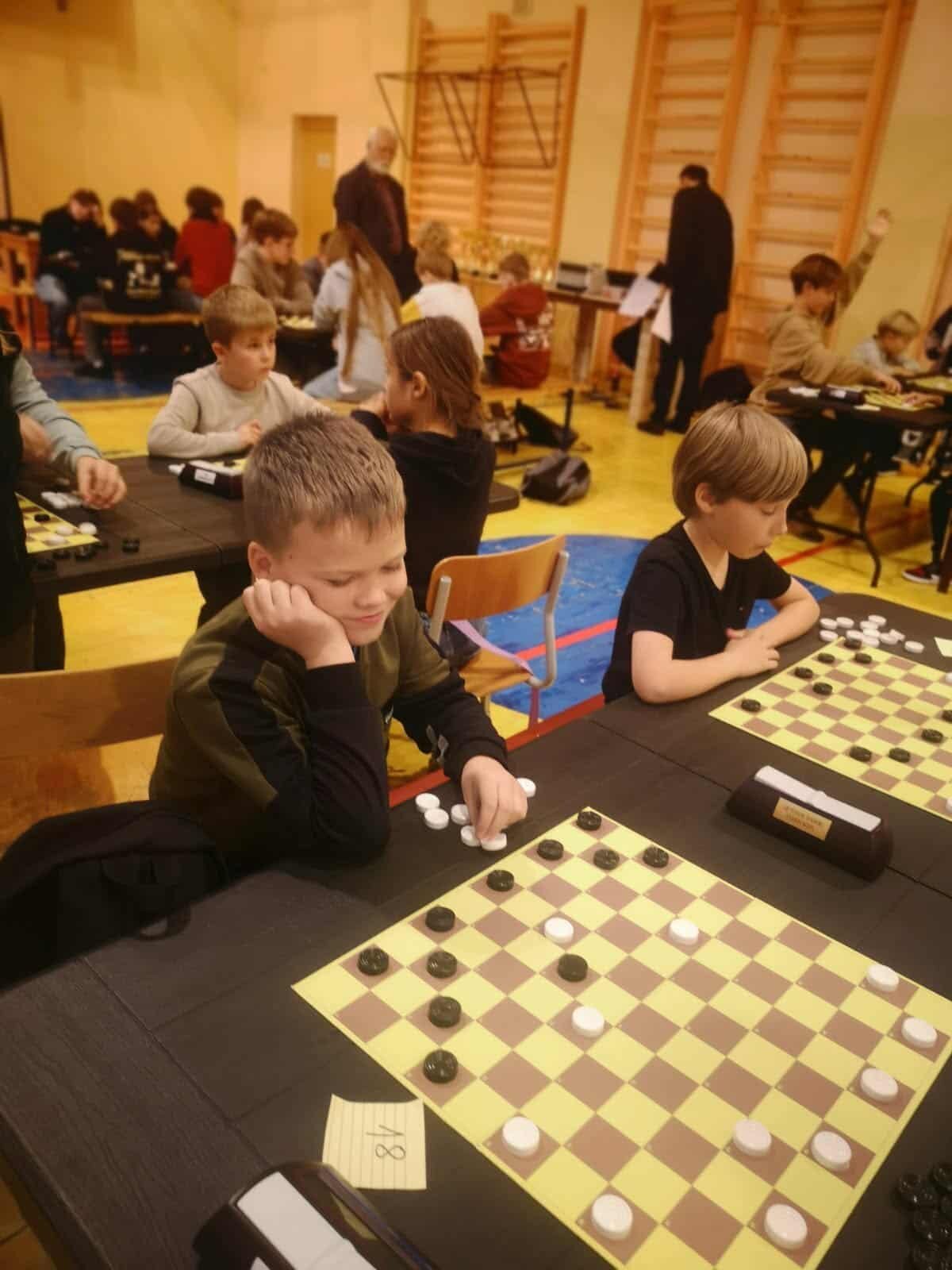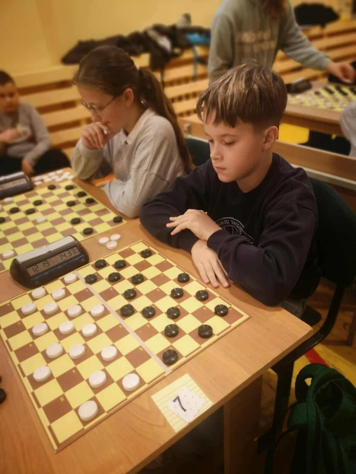 Grupėje iki 8 metų žaidė antrokai Elzė Tomkutė ir Majus Pilkis. Tai buvo jų pirmosios varžybos prie šimtalangės lentos ir tapo gera praktika ateities startams. Jaunučių iki 13 metų grupėje Progimnazijai atstovavo 3 penktokai. Geriausiai sekėsi Tajui Muškietai, kuris pateko į pirmąjį dešimtuką. Nedaug atsiliko Adrijus Tiukša ir Domas Sabaliauskas. Daugiausiai dalyvių (39) susirinko vaikų iki 10 metų. Progimnazijai atstovavo 8 jaunieji šaškininkai. Maloniai nustebino ketvirtokė Joana Kobilinskaitė - ji pasiekė 4 pergales, 2 partijas pralaimėjo, 1 baigė lygiosiomis, pelnė 9 taškus ir užtikrintai užėmė trečiąją vietą. Tai puikus Joanos pasiekimas. Joana žaidė pakankamai atsakingai, su dideliu noru laimėti. Sveikinimai su bronzos medaliu! 8 taškus surinko trečiokas Domantas Jurevičius, po 7 taškus – ketvirtokas Joris Garliauskas, trečiokas Joris Barysas ir antrokė Liepa Čiumbaraitė. Jie įsitvirtino lentelės viduryje. Kiek mažiau taškų trečiokų Dominyko Kasparo, Mildos Tomkutės, Augusto Strekausko, Fausto Janiulio ir Karinos Bušmaitės sąskaitoje. Šioje amžiaus grupėje jie buvo vieni jauniausių ir turės galimybę varžytis visus kitus metus.