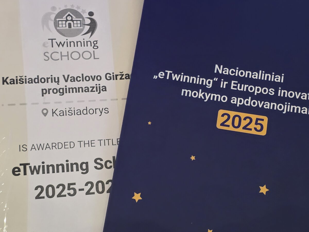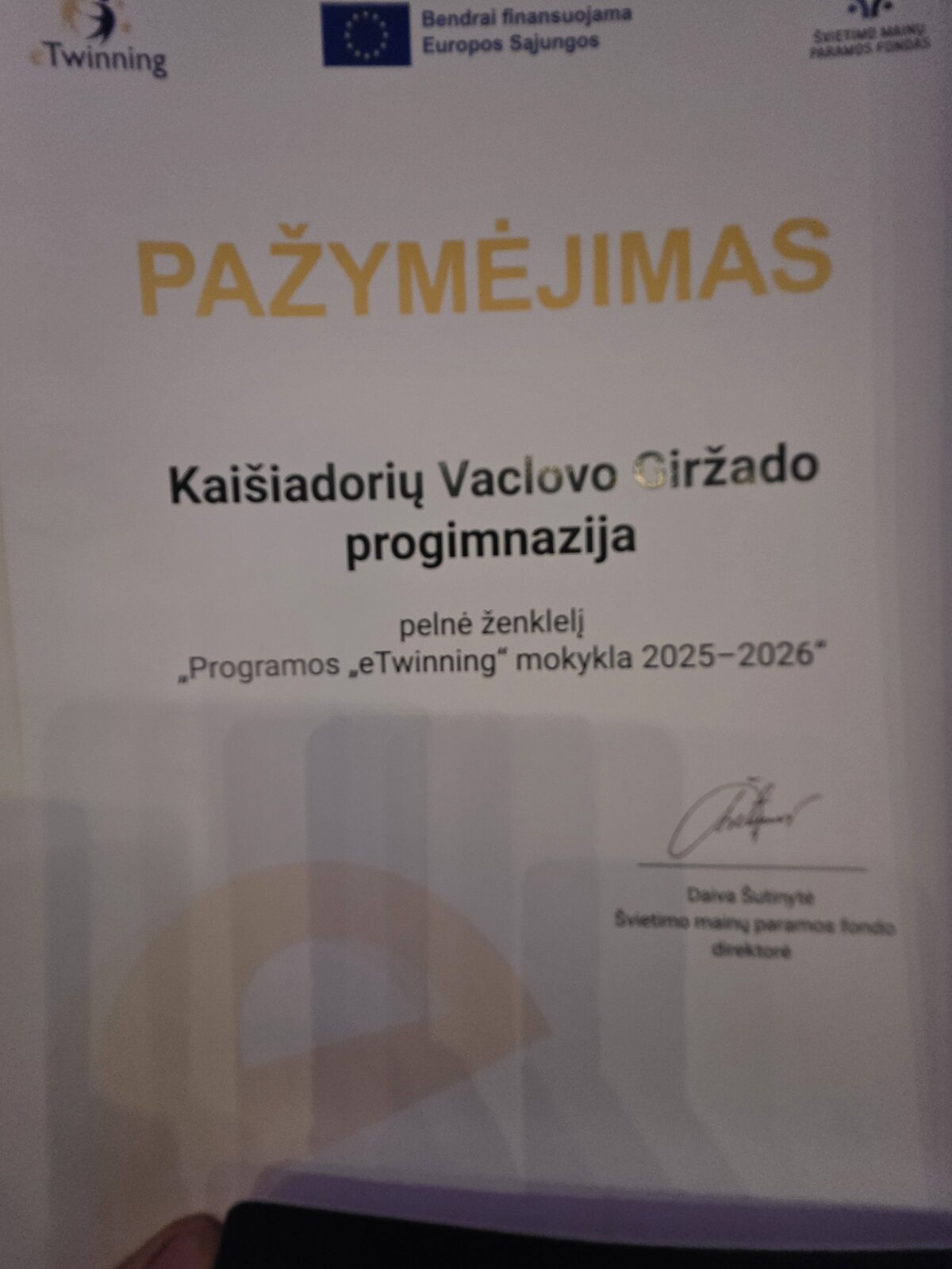 Džiaugiamės, kad jau trečius metus už aktyvų, kokybišką ir produktyvų darbą pelnome svarų nacionalinį bei tarptautinį apdovanojimą ir pripažinimą savo ugdymo įstaigai – „eTwinning School” („eTwinning mokyklos”) ženklelį ir vėliavą. Kaišiadorių Vaclovo Giržado mokykla pelnė „eTwinning mokyklos“ vardą 2020-2021, 2023-2024, 2025-2026 mokslo metais.
