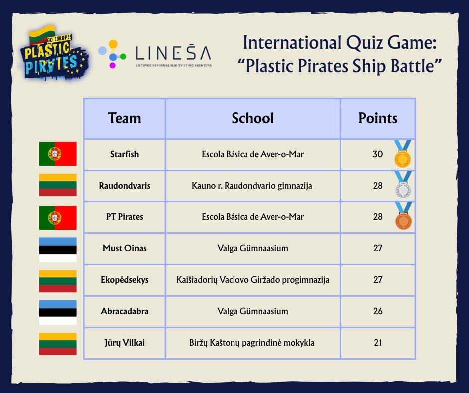 Progimnazijos Gamtosauginio komiteto mokiniai rugsėjo 23, 30 d. dalyvavo ekologinėje viktorinoje sujungtoje su strateginiu jūrų mūšiu. Rugsėjo 30 d. progimnazijos komanda tapo nugalėtoja „Didžiojo Plastiko piratų laivų mūšio“ viktorinoje .