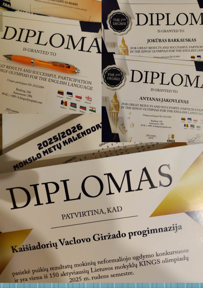Džiaugiamės mokiniams suteikta galimybe pasitikrinti savo anglų kalbos žinias nuotoliniu būdu Tarptautiniame anglų kalbos „Kings.lt 2025-2026“ pirmajame semestre ir patekusieji į finalą, olimpiados finale. Nuotoliniu būdu dalyvavo nemažai mūsų progimnazijos mokinių. Mokiniams skirti I, II, III lygmenų anglų kalbos diplomai, laimėtojams -sertifikatai su išsamiais duomenimis. Mokiniai finalo metu galėjo pasisemti daug naudingos informacijos, išmokti naujų dalykų, atrasti savo žinių spragas ir sužinoti, kuriuos gebėjimus dar reikia tobulinti. Dalyviai įsitikino, kad svarbiausia patiems noriai ir uoliai tobulėti, o kiekvienas dalyvavimas – tai naujos patirtys, plečiančios turimą žinių bagažą!