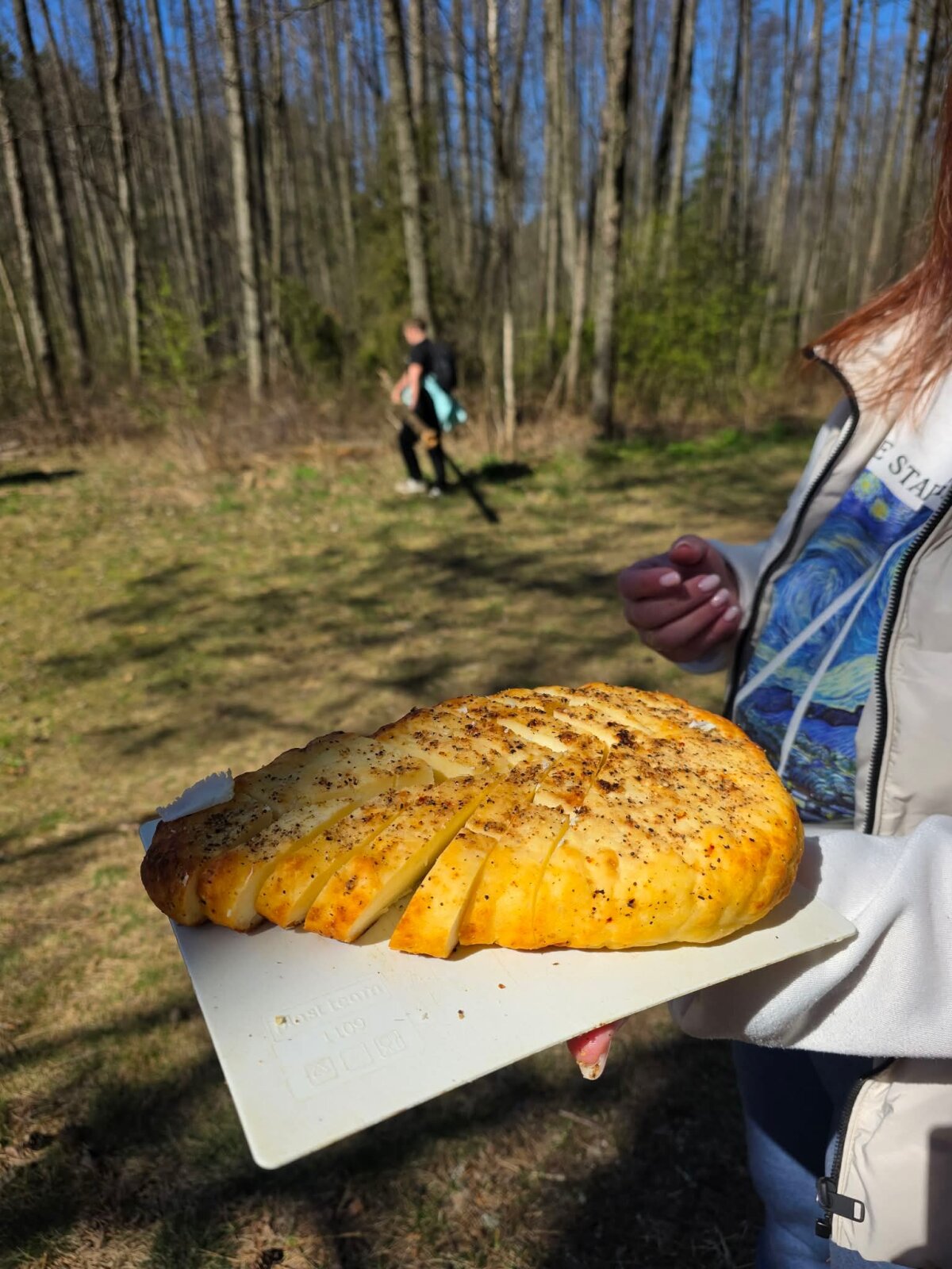 Po aktyvaus žygio šalia Grūdos upės susėdome trumpam poilsiui ir gardžiam užkandžiui. Klasės vadovė visus pavaišino tetos pagamintu tradiciniu, dzūkišku sūriu. Kadangi Dzūkija neatsiejama nuo grybų, nors ir ne rudens sezonas, prie kavos puodelio mėgavomės desertiniais „grybukais“.
