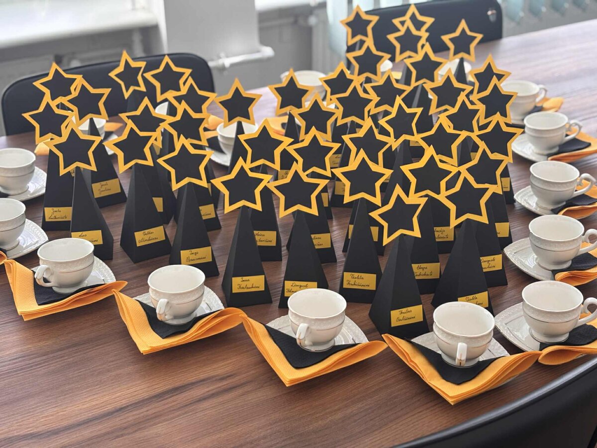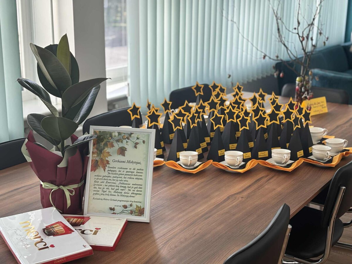 Šiemet Mokytojų dieną šventėme spalio 3-iąją, nes tikroji šventė, spalio 5-oji, šiemet sutapo su savaitgaliu. Tačiau tai nesutrukdė sukurti tikros šventinės atmosferos! Nuo pat ryto MAK'o nariai pasitiko mokytojus su šypsenomis, mokinių paruoštais muzikiniais sveikinimais, pačių nertomis rožėmis, kvapnia kava bei gardžiais skanėstais. Mokytojų nuotaiką dar labiau pakėlė specialiai įrengtas foto kampelis "Jūs mūsų ŽVAIGŽDĖS", kuriame kiekvienas galėjo įamžinti smagias akimirkas. Vėliau mokytojai dalyvavo interaktyviame žaidime „Kahoot“, kuriame turėjo atsakyti į klausimus apie mokinius – kuo jie gyvena, kas jiems įdomu, kokios jų kasdieninės frazės yra bendravimo norma. Juoko buvo daug, o mokytojai dar kartą įsitikino, kokie nuostabūs mūsų mokiniai. Šventės kulminacija – vardinės Oskaro statulėlės kiekvienam mokytojui, simbolizuojančios jų atsidavimą ir energiją, kurią jie skiria mokyklai. Be to, visi galėjo pasimėgauti trumpu filmuku-sveikinimu, kuris atskleidė mokytojų darbą, kantrybę ir įkvėpimą, kurį jie kasdien suteikia savo mokiniams.