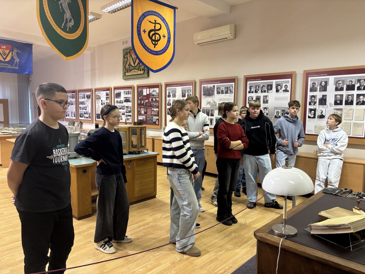 Spalio pabaigoje 7a klasės mokiniai leidosi į turiningą ir įdomią pažintinę išvyką. Dieną jie pradėjo Lietuvos sveikatos mokslų universiteto Veterinarijos akademijoje, kur aplankė muziejų, stambiųjų gyvūnų kliniką ir gyvūnų operacines. Muziejuje mokiniai sužinojo, kaip keitėsi veterinarijos mokslas bėgant metams, apžiūrėjo senovinius medicinos prietaisus, gyvūnų griaučius ir anatominius preparatus. Stambiųjų gyvūnų klinikoje septintokai turėjo galimybę iš arti pamatyti, kaip atrodo gyvūnų operacinės, kaip gydomi arkliai, karvės bei kiti gyvūnai. Ekskursijos vadovai papasakojo apie veterinaro darbą, atsakomybę ir meilę gyvūnams.