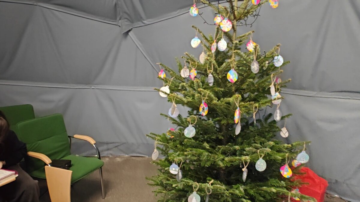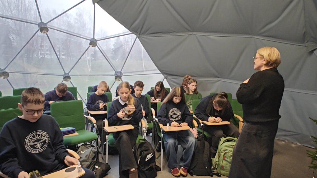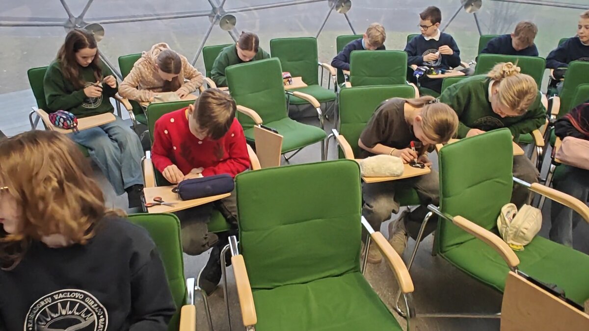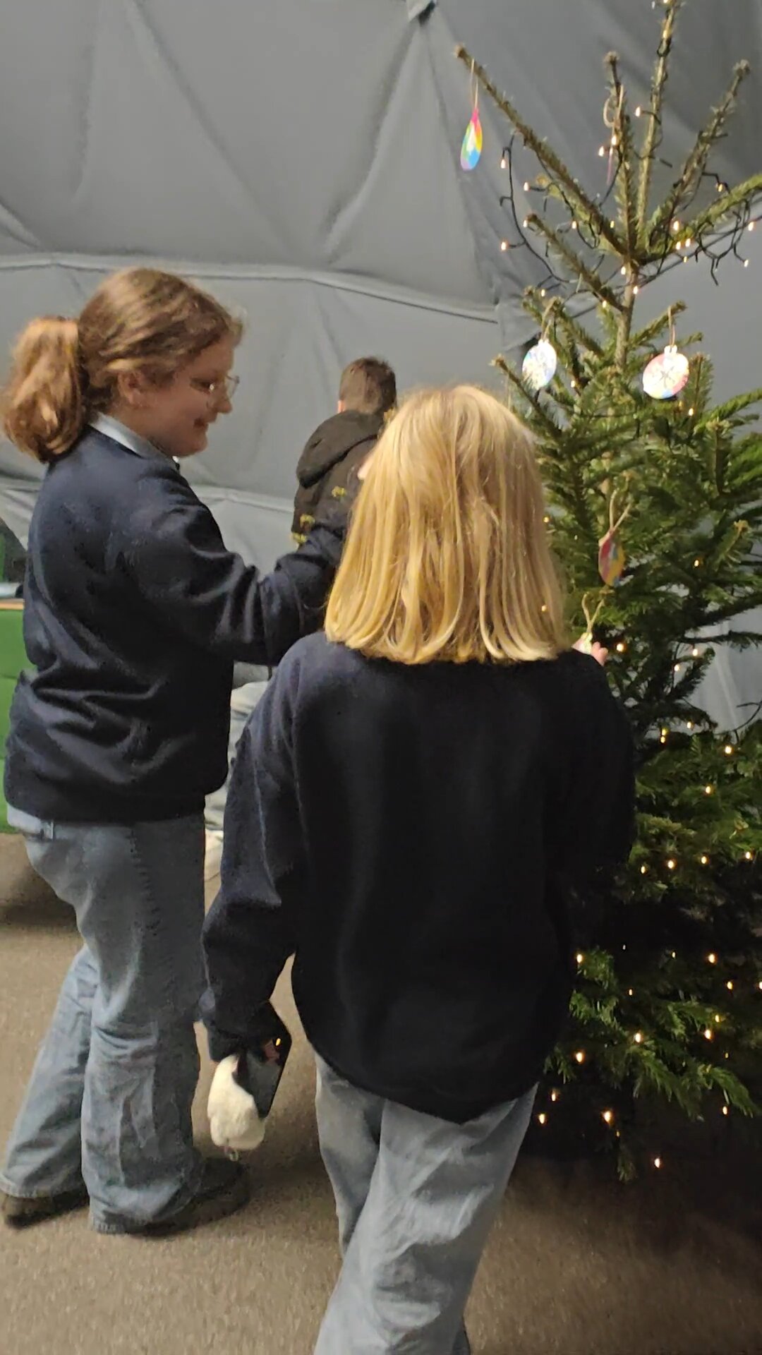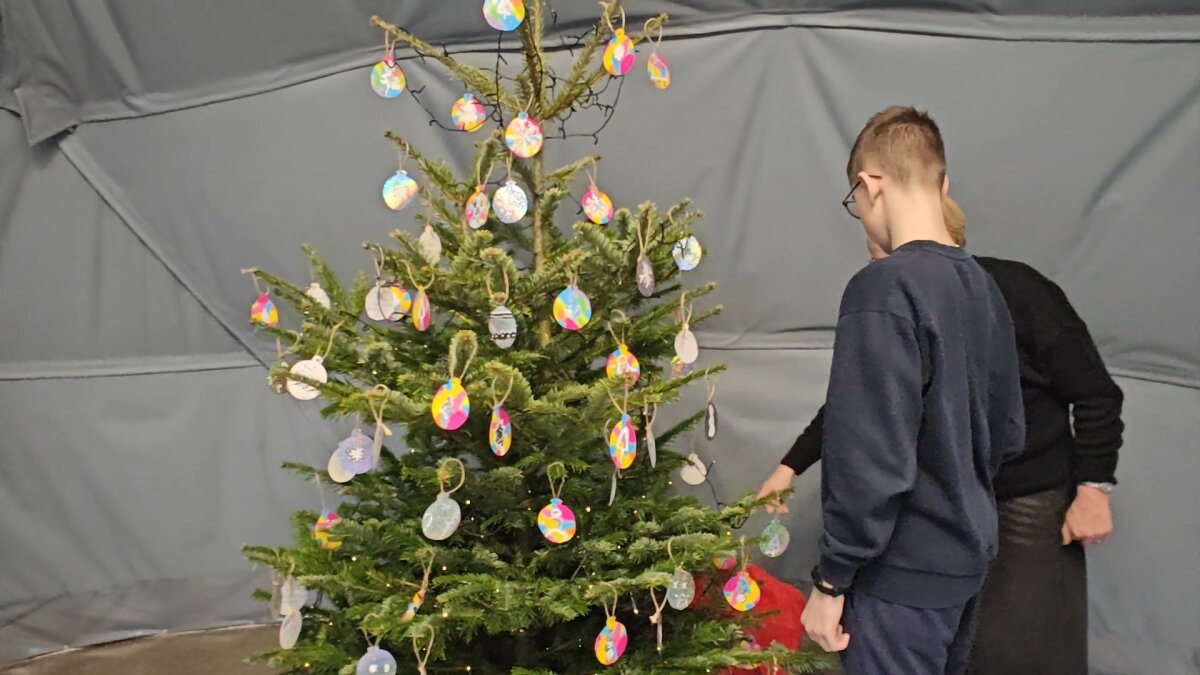Kitoje žaisliuko pusėje mokiniai kaligrafiškai užrašė kalėdinius sveikinimus – šiltus palinkėjimus, kupinus gerumo, ramybės ir šventinės nuotaikos. Tai buvo puiki proga lavinti rašto estetiką, kantrybę ir atidumą detalei, taip pat apmąstyti Kalėdų prasmę. Edukacijos kulminacija tapo progimnazijos kupolo eglutės puošimas – mokinių rankomis sukurti žaisliukai virto išskirtine šventine puošmena, papuošusia bendrą mokyklos erdvę. Kiekvienas ornamentas tapo ne tik dekoracija, bet ir asmeniniu palinkėjimu visai mokyklos bendruomenei.