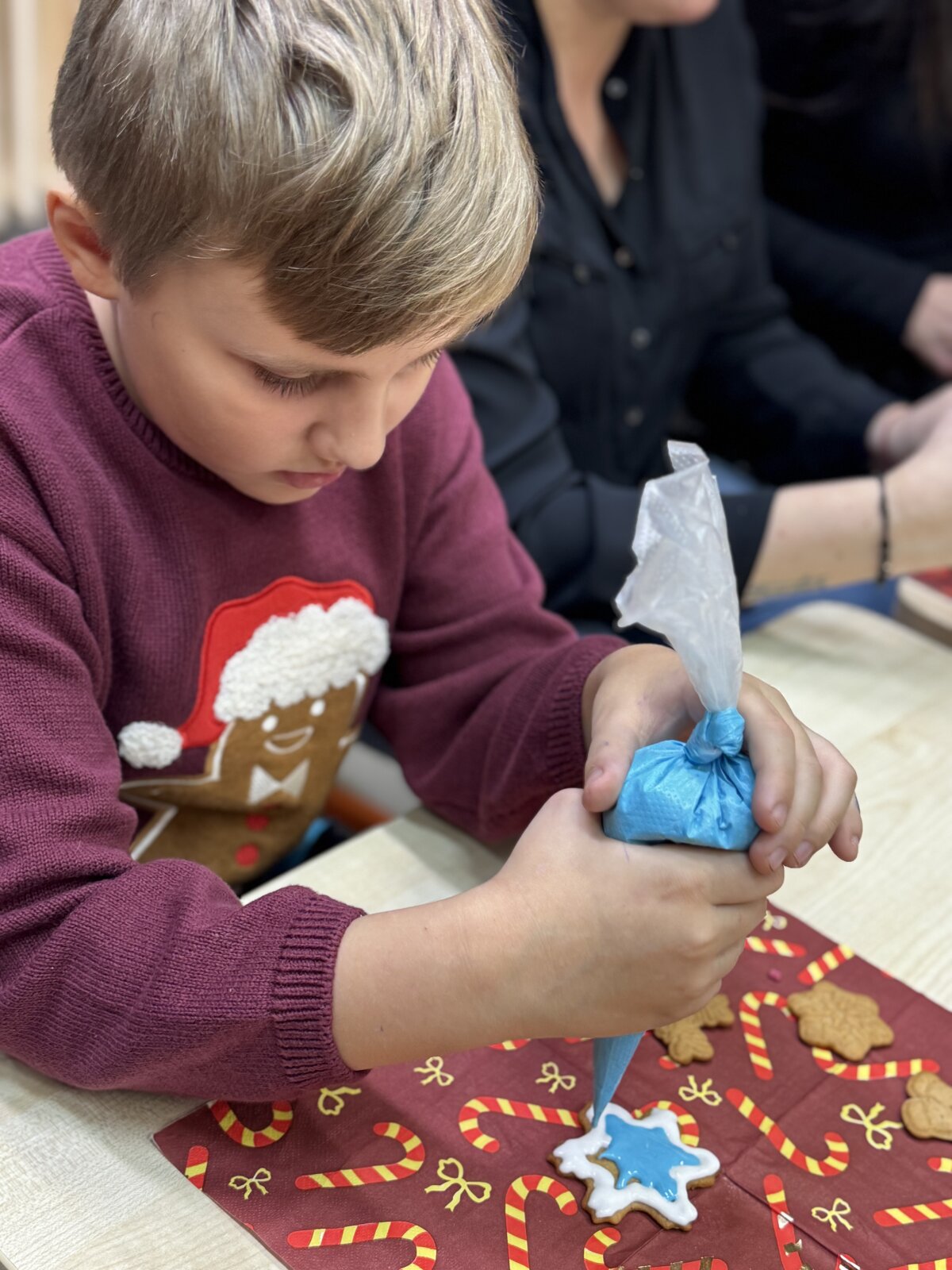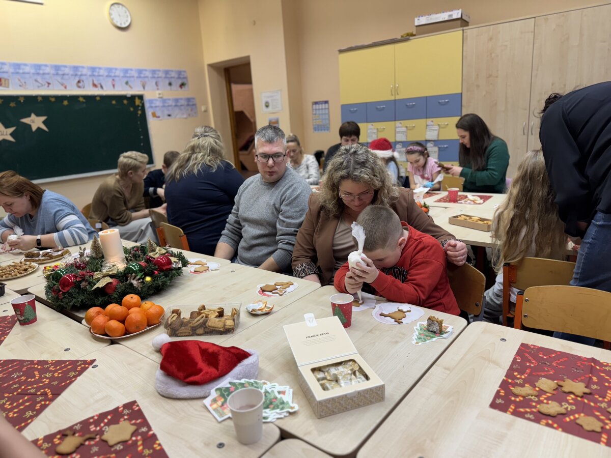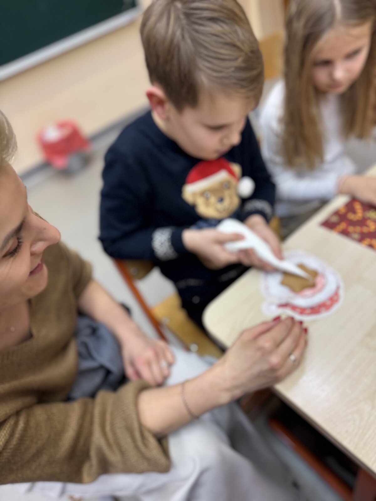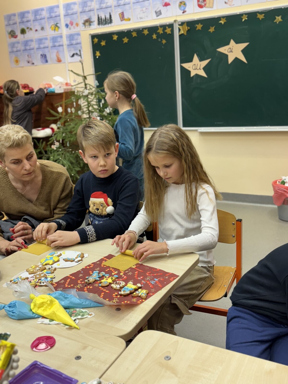 Vakaronėje padedant vienai iš klasės mamyčių visi kartu dekoravome meduolius. Kūrybinė veikla suvienijo vaikus ir tėvus, o šventinę atmosferą dar labiau sustiprino karšta kakava, arbata ir įvairūs skanėstai, kuriais vaišinomės. Kiekvienai šeimai mokytoja pasiūlė prasmingą veiklą – pasigaminti po šventinę žvakę iš bičių vaško. Kartu susisukome po žvakę, kuri taps jaukiu akcentu namuose ir primins šį gražų bendrystės vakarą.