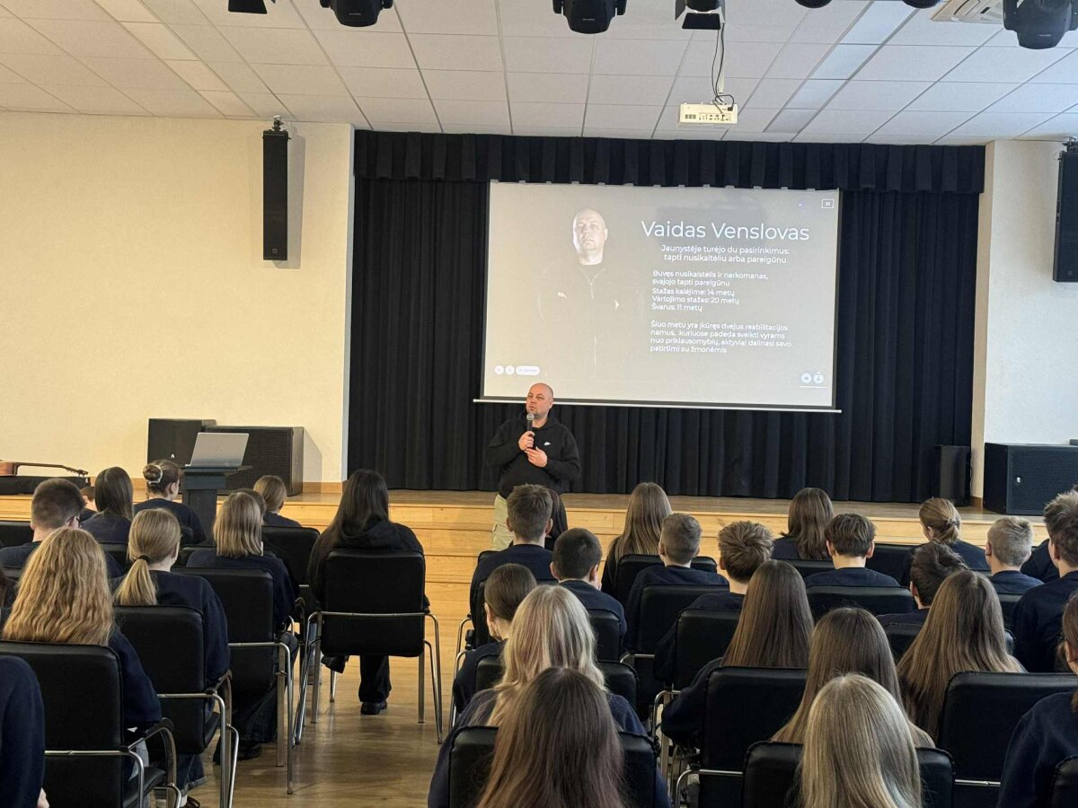 Dalius Mackela į sceną pakvietė ir Vaidą Venslovą, kuris mokiniams atvirai papasakojo savo asmeninę gyvenimo patirtį. Vaidas dalijosi istorija apie tai, kaip kartą suklupus labai sunku sugrįžti į teisingą gyvenimo kelią, su kokiais iššūkiais tenka susidurti ir kiek pastangų reikalauja sprendimas keistis. Jo pasakojimas tapo stipriu priminimu, kokias pasekmes gali turėti neatsakingi sprendimai ir kaip svarbu laiku pasirinkti teisingą kryptį.
