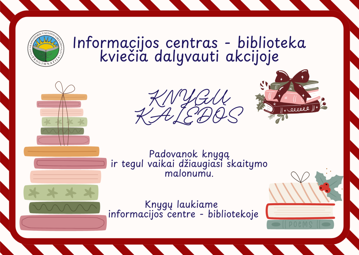 Biblioteka pradėjo akciją „Knygų Kalėdos“, kviesdama visus – mokinius, jų tėvelius, mokytojus ir draugus – padovanoti knygą ir prisidėti prie dar turtingesnio bei įvairesnio bibliotekos fondo kūrimo. Dovanotos knygos taps naujais atradimais mūsų jauniesiems skaitytojams, o kiekvienas geros valios gestas padės paskatinti meilę skaitymui ir žinių troškimą.
