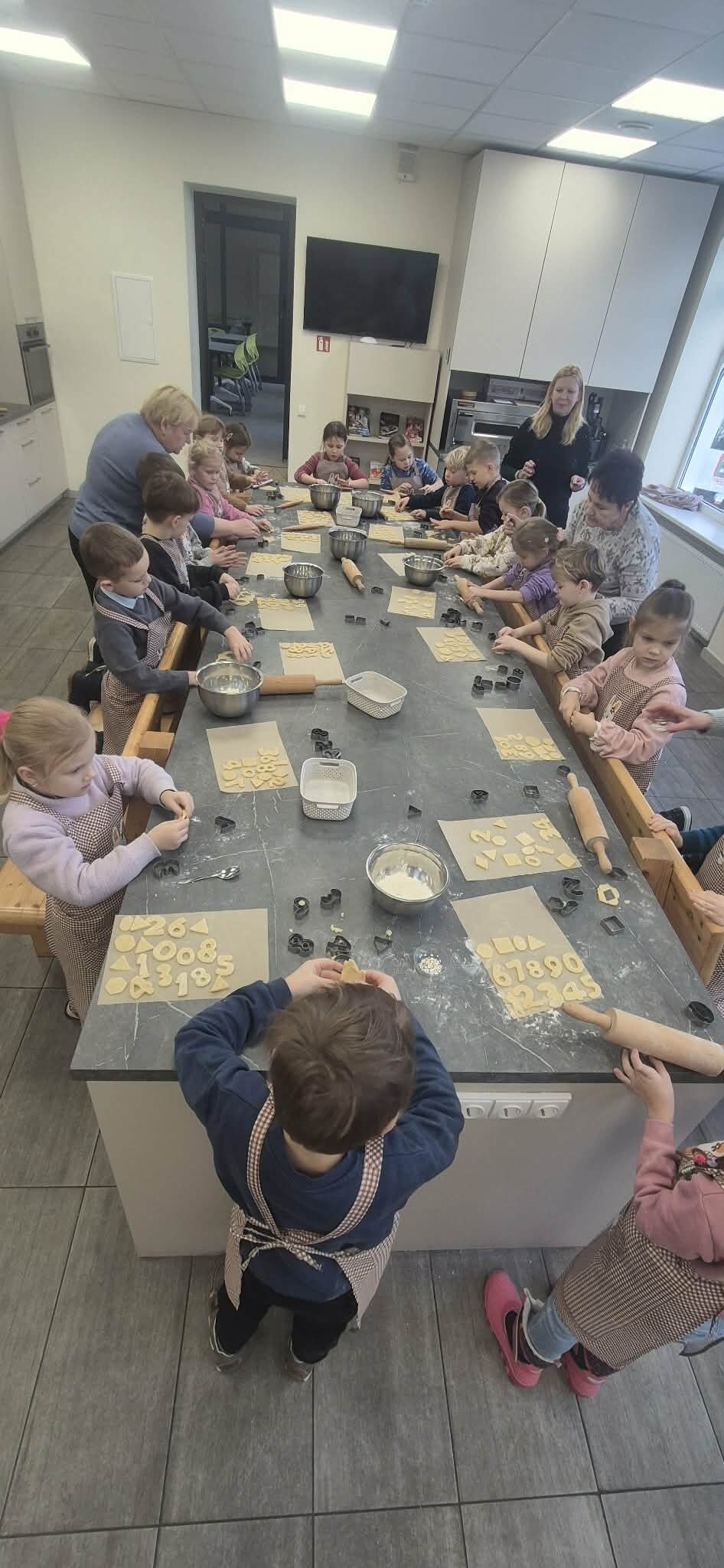 Vaikai su dideliu džiaugsmu patys kočiojo tešlą, kruopščiai formelėmis įspausdami formavo skaičių bei įvairių formų sausainėlius. Puošė juos pabarstukais bei ruošė kepimui.