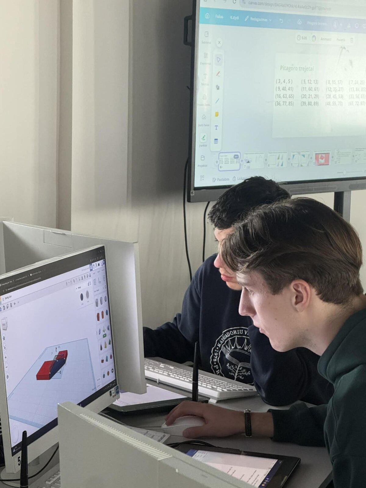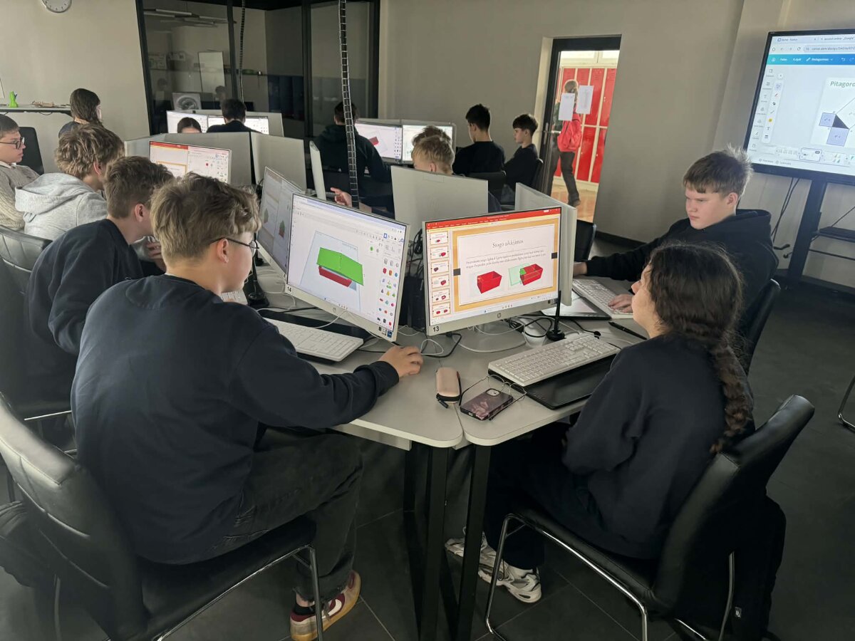Projektas buvo įgyvendintas per dviejų pamokų ciklą. Pirmosios pamokos metu mokiniai gilinosi į teorinę medžiagą: susipažino su Pitagoro teoremos kilme, istoriniu kontekstu, jos taikymo sritimis. Antroji projekto dalis persikėlė į virtualią „Tinkercad“ erdvę, kur mokiniai turėjo ne tik „nupiešti“ trikampį, bet ir sukurti veikiantį fizinį modelį, pagrįstą matematine logika. Pasirinkę Pitagoro trejetus, jie kūrė tūrinius dėklus trikampio kraštinėms. Tai nebuvo tik sausas modeliavimas – mokiniai susidūrė su realiais inžineriniais iššūkiais. Jie išmoko, kad norint, jog 3D spausdinti kubeliai sklandžiai tilptų į dėklus, būtina numatyti laisvumą, nes virtuali erdvė ir fizinis pasaulis turi savo taisykles. Naudodami skaitmeninius įrankius pagrindui ir preciziškai lygiuodami kiekvieną kampą, mokiniai stebėjo, kaip jų ekranuose gimsta vientisas, gamybai paruoštas inžinerinis objektas.