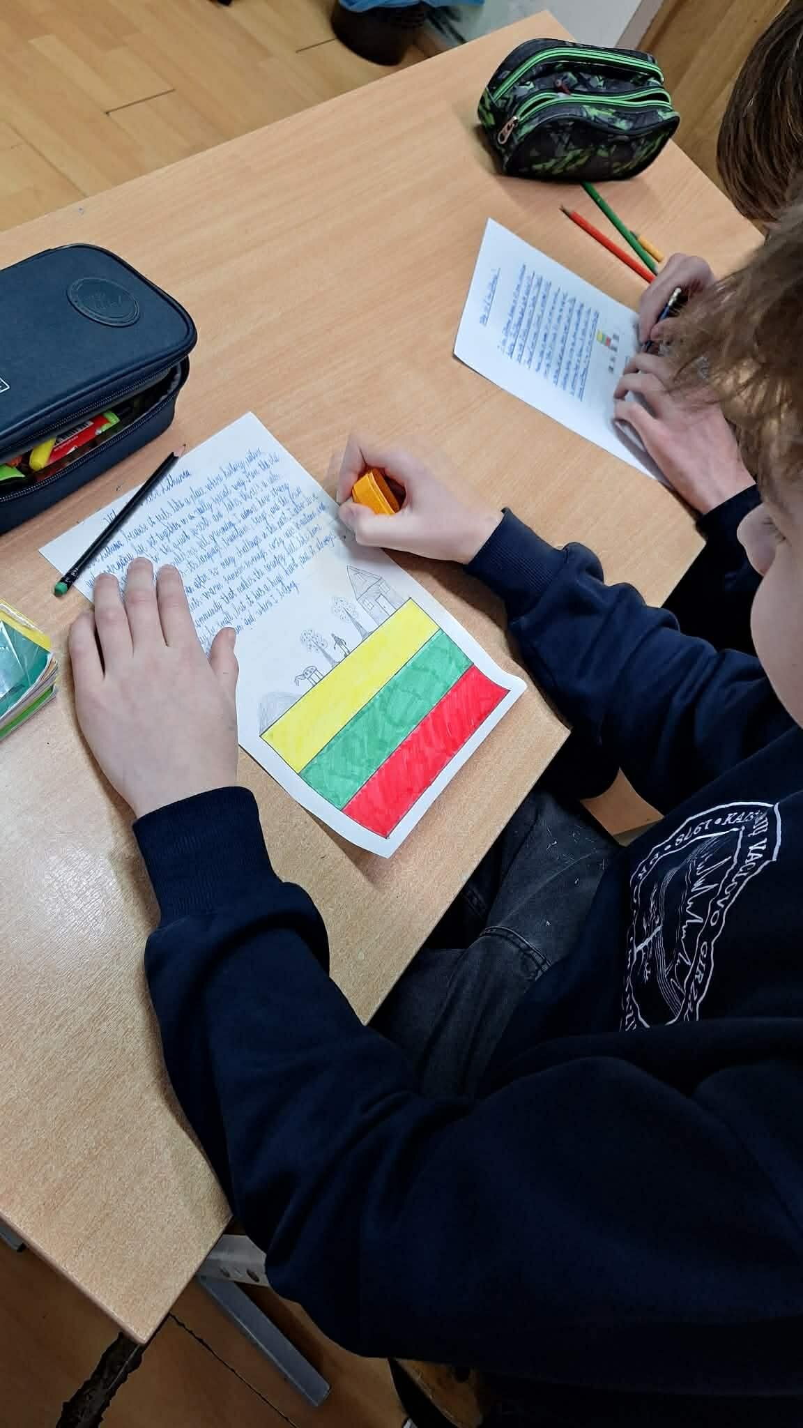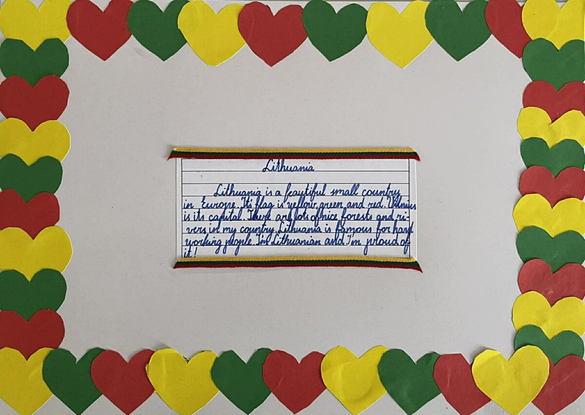 Vyresniųjų klasių mokiniai rašė trumpas pastraipas apie tai, kodėl jie myli Lietuvą. Vieni minėjo mūsų kalbą, kuri skamba kaip daina. Kiti – nuostabią gamtą, žalius miškus, ežerus ir Baltijos jūrą. Kai kurie rašė apie laisvę, istoriją ir žmones, kurie kasdien kuria mūsų šalį geresnę. Jų žodžiuose skambėjo pasididžiavimas, dėkingumas ir viltis. Mažesnieji mokiniai savo meilę Lietuvai išreiškė spalvingomis širdelėmis. Ant jų jie užrašė paprastus, bet labai nuoširdžius žodžius: „namai“, „draugai“, „miškai“, „krepšinis“, „šeima“, „laisvė“. Šios širdelės papuošė mokyklos erdves ir priminė, kad meilė Tėvynei prasideda nuo mažų, bet tikrų jausmų. Projektas sujungė visą mokyklos bendruomenę – nuo mažiausių iki vyriausių. Kiekvienas turėjome progą sustoti, pagalvoti ir pasakyti: kodėl mes mylime Lietuvą?