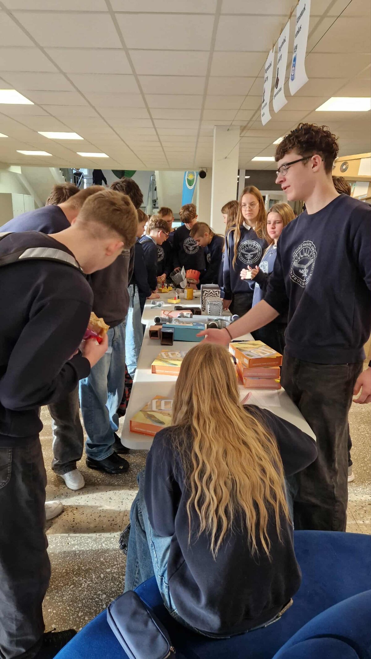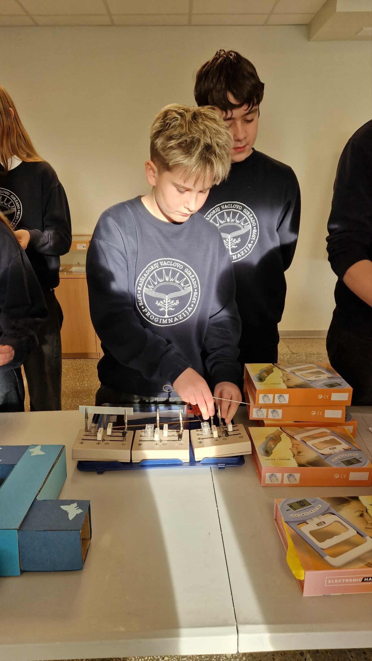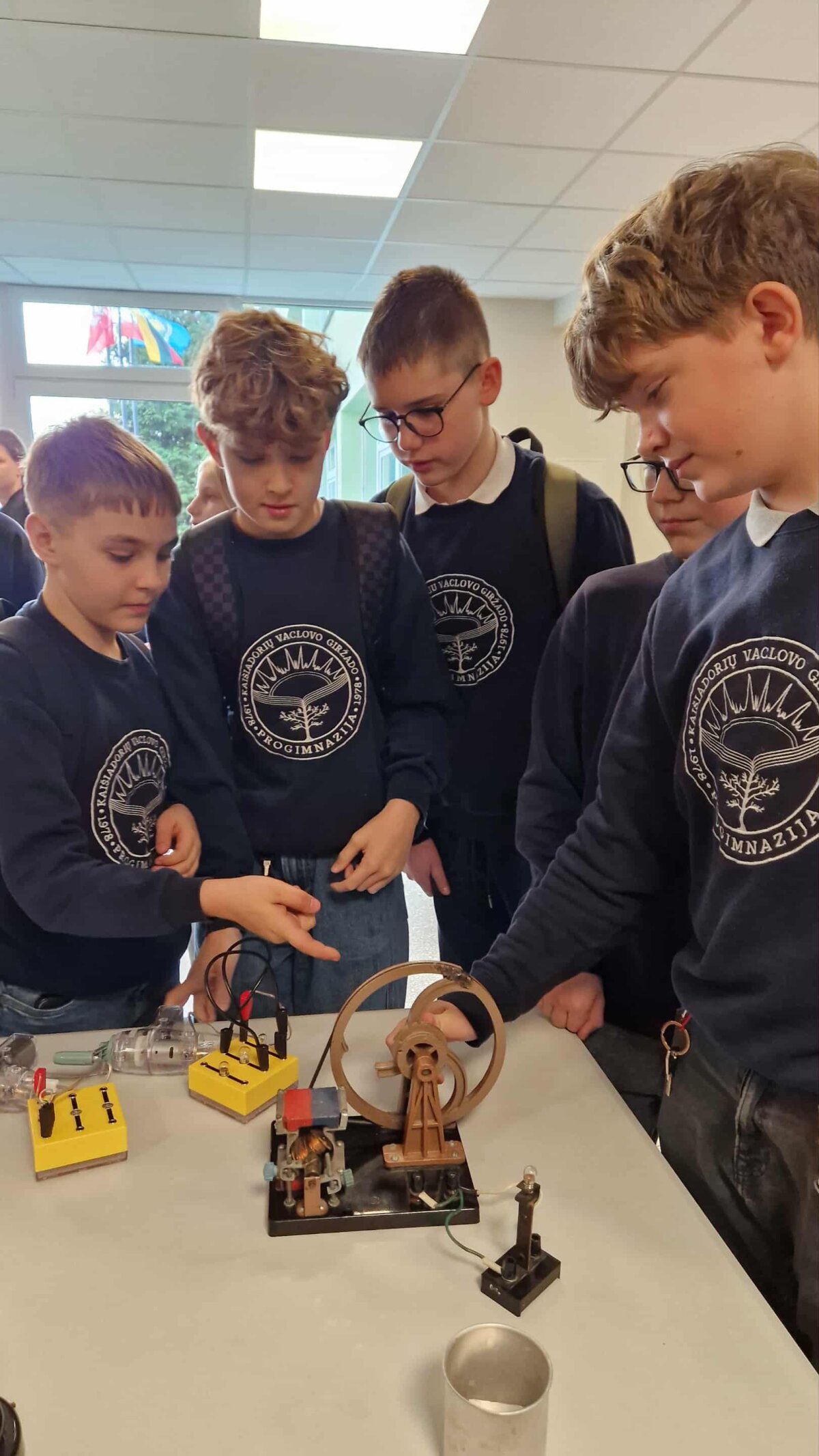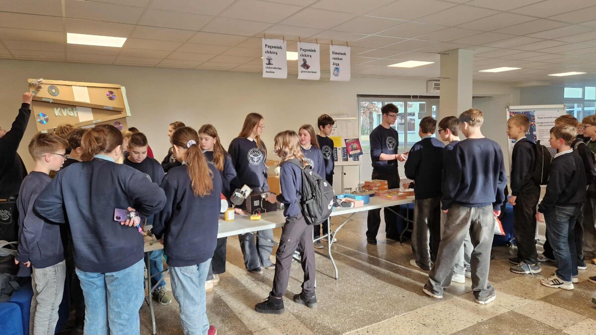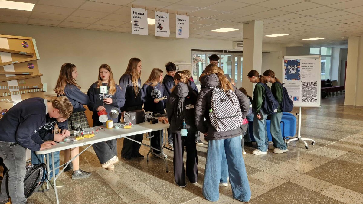 Progimnazijos mokiniai, mokytojai buvo kviečiami: dinamometru išmatuoti rankos jėgą, patyrinėti medžiagų laidumą, pagaminti elektrą su ranka sukamu generatoriumi.