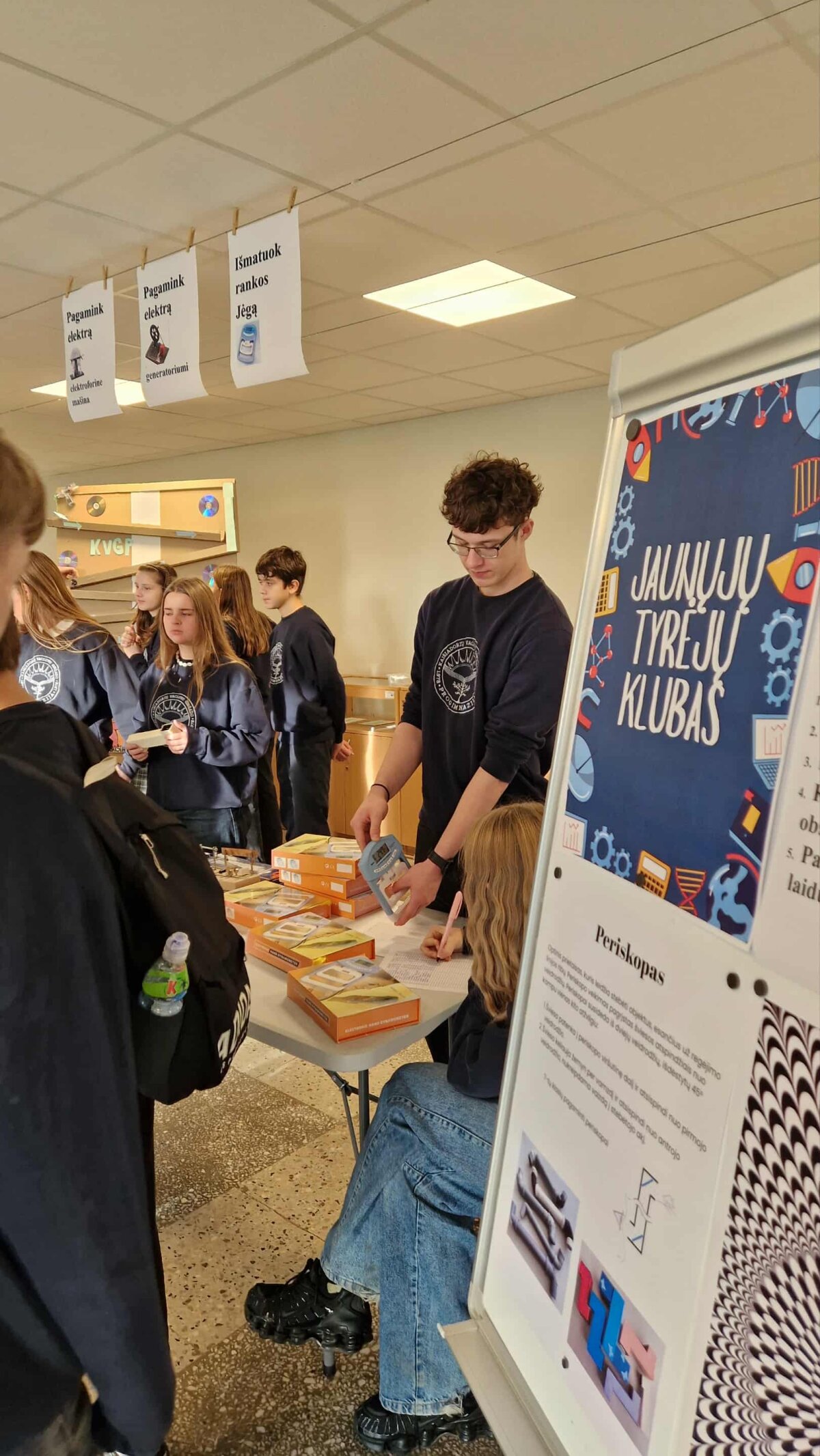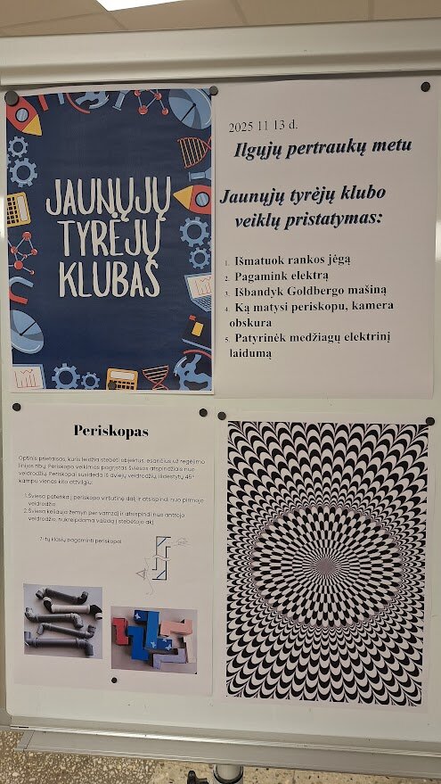 Klubo nariai demonstravo mokinių pagamintus optikos prietaisus: periskopą, kamera obskurą, zootropą. Periskopas – optinis prietaisas stebėti aplinką iš slėptuvės. Camera obscura – pro mažą skylutę įsiskverbianti šviesa ant visiškai tamsios sienos projektuoja apverstą vaizdą, fotokameros prototipas. Zootropas – tai optinis prietaisas, kuriame besisukančių paveiksliukų seka sudaro filmuko įspūdį.